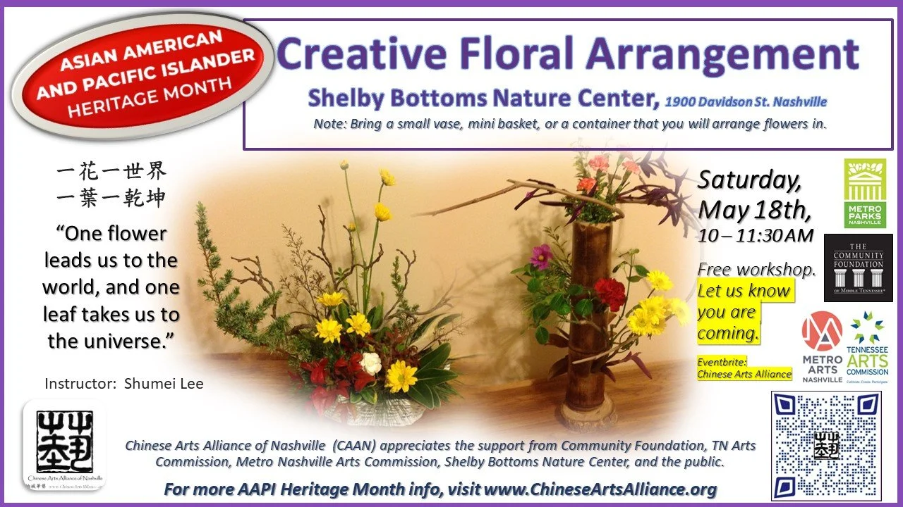 Chinese Arts Alliance of Nashville (CAAN) is grateful for the support from the Community Foundation, TN Arts Commission, Metro Nashville Arts Commission, the Shelby Bottom Nature Center, and the public!