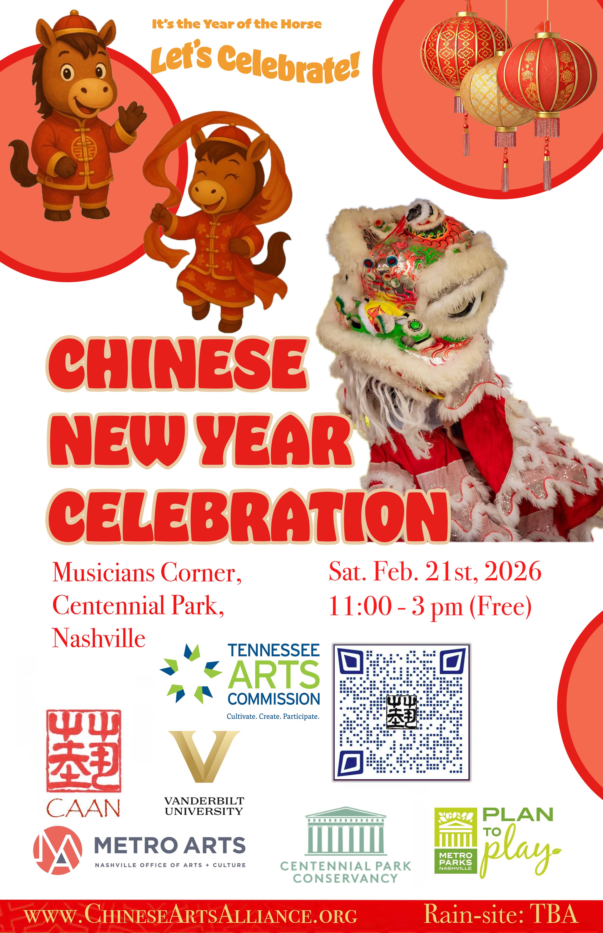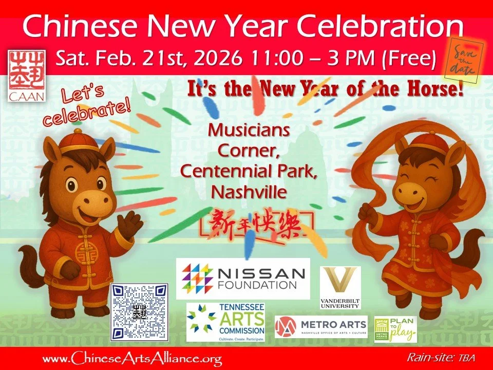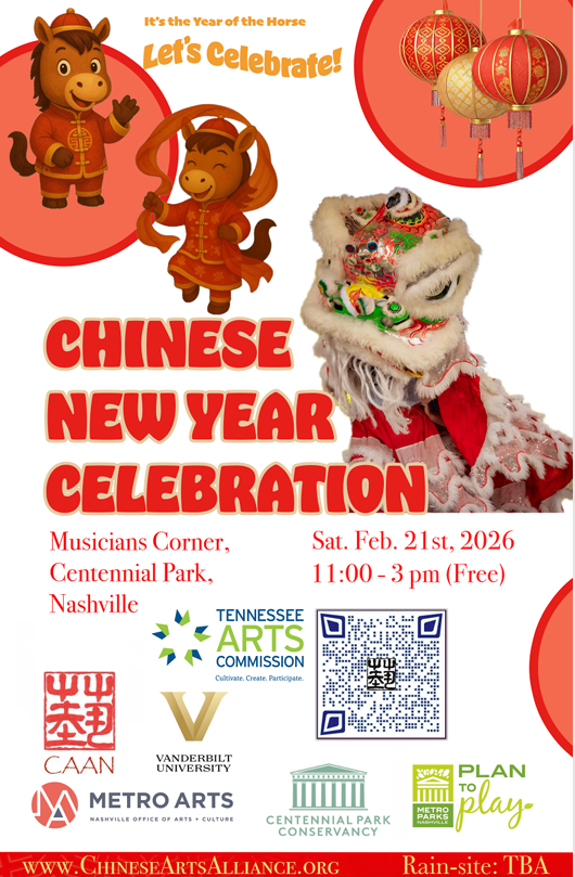 Chinese Arts Alliance of Nashville (CAAN) is hosting its annual Chinese New Year Celebration at Musicians Corner, Centennial Park on Saturday, 2/21/2026, from 11 AM to 3 PM.